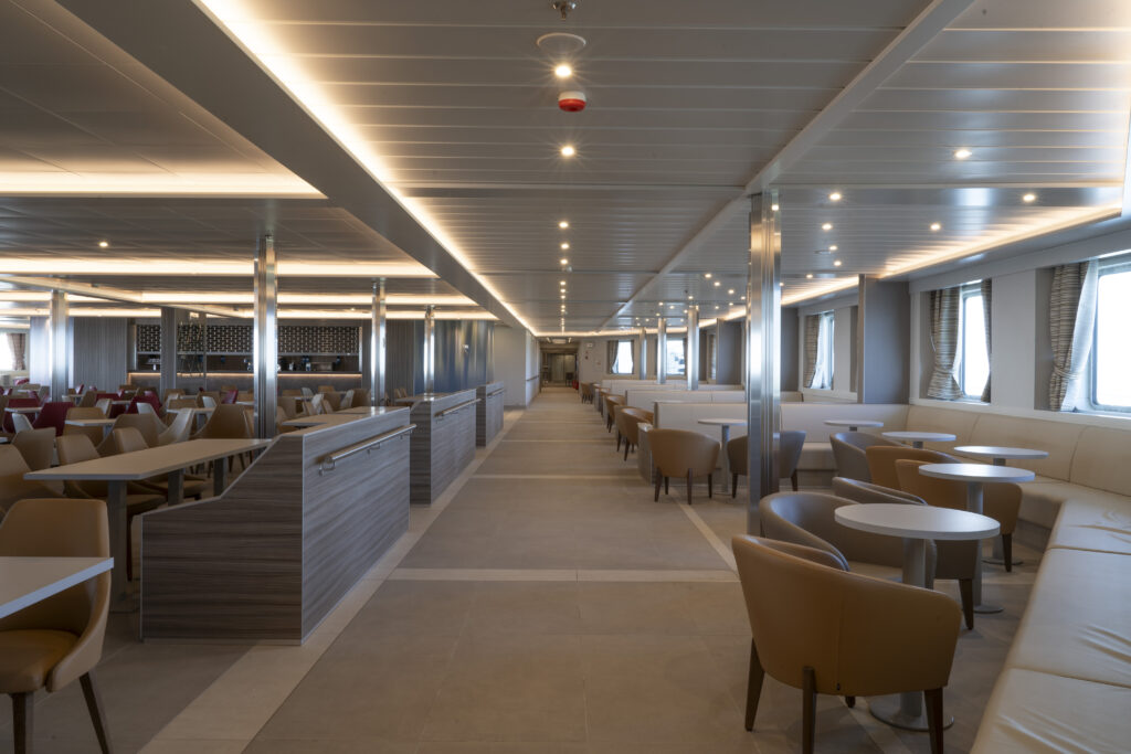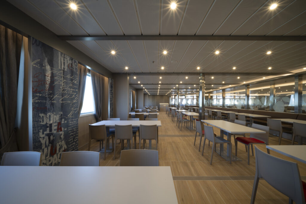 Prom wyposażony jest w przestronną strefę gastronomiczną, która obejmuje bar i restaurację, gdzie pasażerowie mogą cieszyć się różnorodnymi daniami i napojami. Dodatkowo, na pokładzie znajduje się sklep, który oferuje szeroki wybór produktów dla podróżnych.